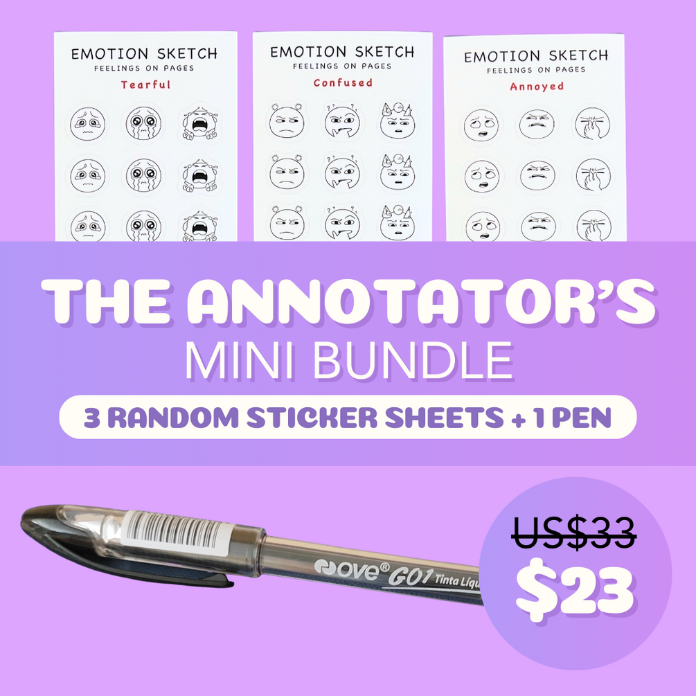 ✔️ 3 random sheets from our Original Emotion Sketch collection — tiny, transparent stickers (0.4" x 0.4") made to fit perfectly in your book margins and between paragraphs.